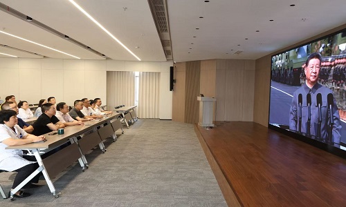 上午9时,阅兵式准时开始,当国歌奏响的那一刻,全体人员自发起立,共同高唱中华人民共和国国歌。激昂的旋律在室内回响,爱国之情在每个人心中激荡。中共中央总书记、国家主席、中央军委主席习近平在阅兵式上发表重要讲话并开始检阅部队。阅兵式展示了45个方队,看到一声声正步铿锵有力;一个个方队英姿飒爽;一辆辆车队的井然有序;一架架战机的锐不可当,数字空间部队、信息支援部队等首次亮相阅兵式。会议室里掌声不断,大家全神贯注,赞叹连连,无不为我们中华民族的日益繁荣而感到由衷的自豪。