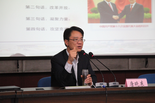唐校长《十八大报告热点解析》的报告重点围绕党的十八大报告的中心思想,结合自身的学习体会,以生动的语言,独到的见解对党的十八大报告“科学发展观、不走老路邪路、全面建成小康社会、加快转变发展方式、建设美丽中国”五个方面的内容进行了深入浅出的讲解,报告内容丰富,既有理论分析,又有实践佐证,对全院党员进一步系统学习十八大精神、准确把握大会主题、深入理解内涵实质,具有重要的指导意义。