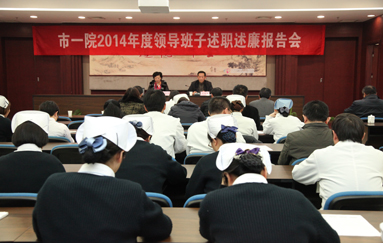 12月16日下午,我院在行政中心第三会议室召开2014年度领导班子述职述廉大会,市卫生局党委副书记季春郁主持会议,医院领导班子及全体中层干部参加会议。