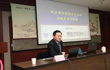 “来到家乡讲课,倍感亲切。”秦院长一开场便拉近与在场人员之间的距离。秦院长首先深入剖析了新医改对医院科学发展提出的要求以及医院学科发展面临的困难和问题,他指出面对医改新形势,应顺势而为、积极主动应对,深化内涵建设,一是要高度重视新医改形势下医院发展新趋势;二是把握内在规律,提升临床发展能力;三是落实科研人才一体化,快速提升核心竞争力;四是完善激励考核机制,充分体现发展导向。秦院长结合上海市第十人民医院改革实践,着重阐述了学科是医院可持续发展的灵魂,人才是医院可持续发展的根本,临床是医院可持续发展的基础,科技是医院可持续发展的动力,教育是医院可持续发展的后劲,制度是医院可持续发展的保证等理念。秦院长精彩的经验介绍和诙谐生动的举例说明给大家留下了深刻的印象,近三个小时的讲课,会场内座无虚席,气氛热烈。