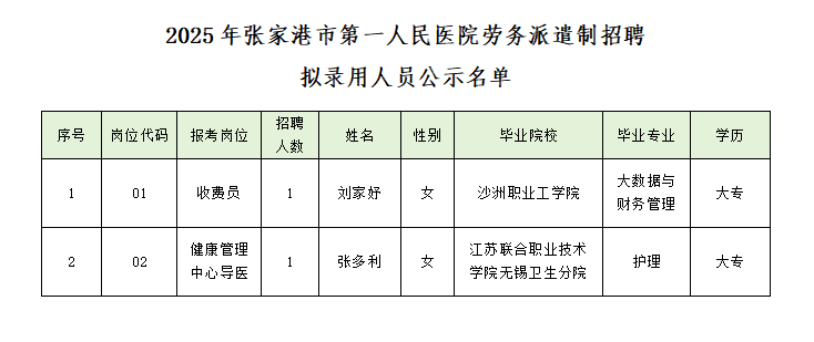 根据《2025年张家港市第一人民医院招聘劳务派遣人员公告》,经过现场报名及同步资格审核、考试、体检、考察等程序,现将拟录用人员予以公示。